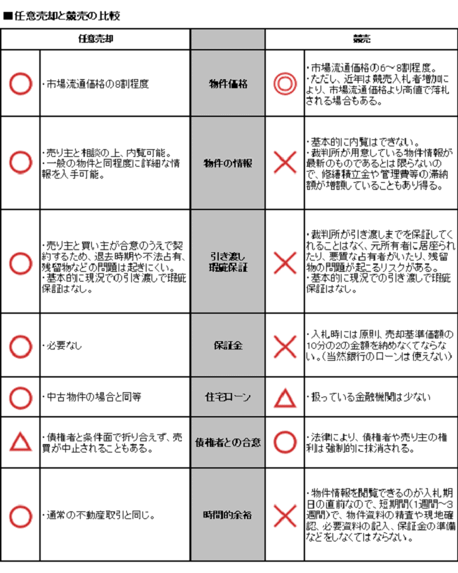 任意売却と競売を比較すると、物件価格面では、競売物件の方が安く購入できる可能性があります。ただし、最近の競売入札者の増加により、特に人気が集中した物件などは、市場流通価格と同じかそれ以上の高値で落札されるケースも結構あります。